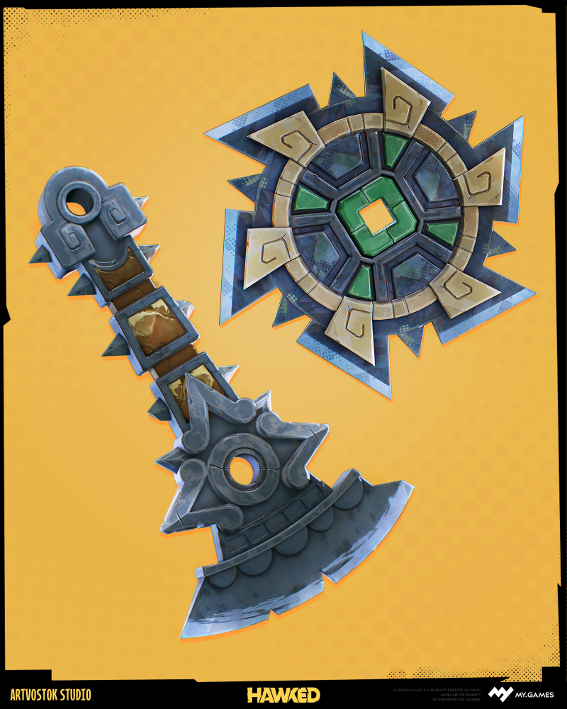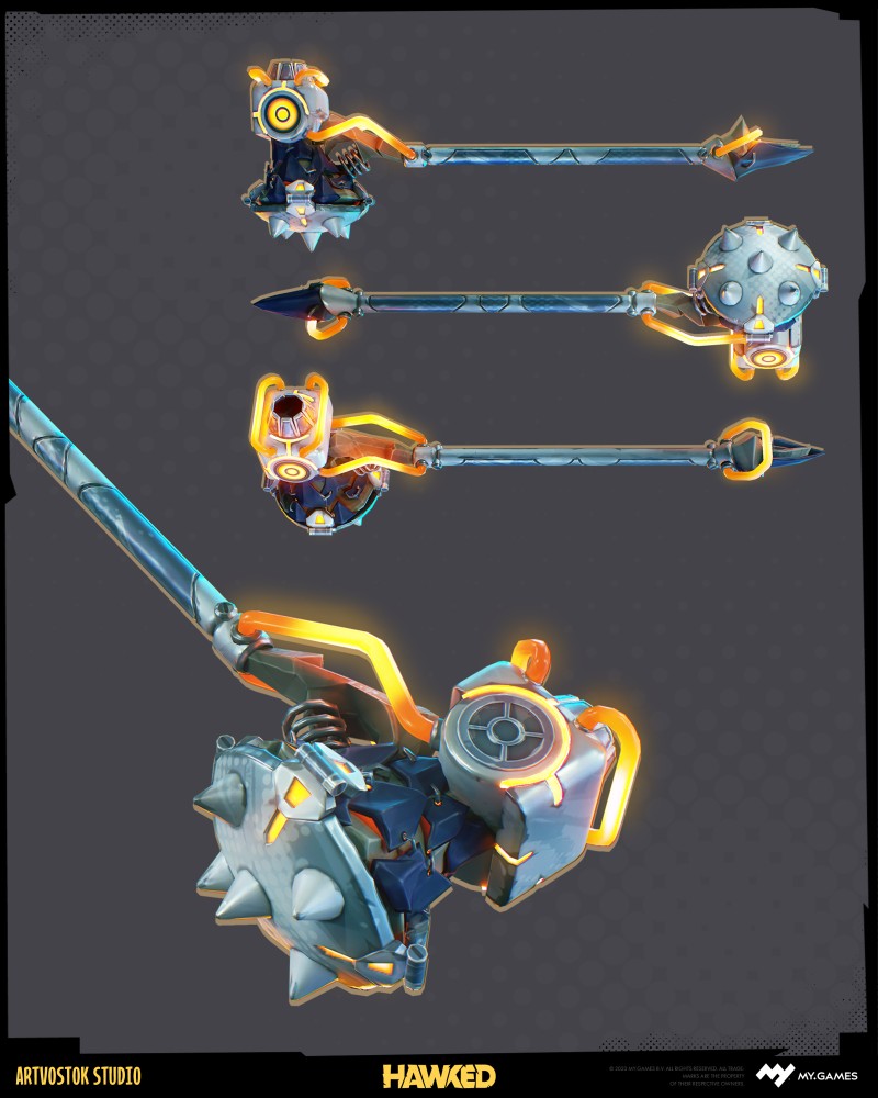 This hammer was done with the help of the clients’ concept team and was made almost purely on Blender with further high poly in ZBrush and painted in Substance Painter. They all had a limited polycount which is highly important for the game’s productivity, so it was a bit of a challenge fitting one model into one texture set with a proper texel density. And see these awesome and quite unique comics-like effects? Those masks modificator was made by awesome team at My.Gamesand used by us while texturing to achieve that vibe: