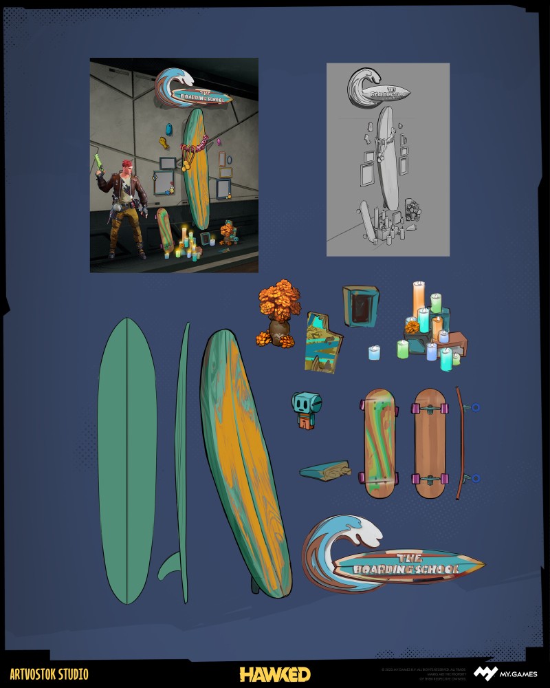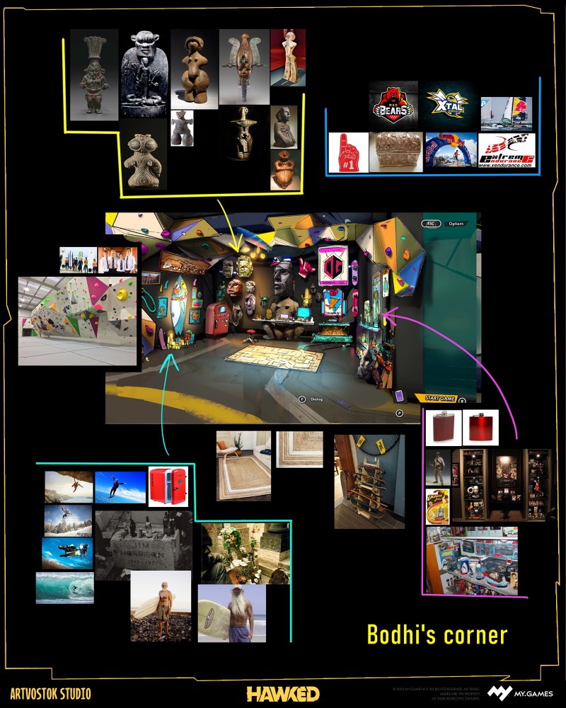 Once the 3D environment tasks were underway, the client team invited us to dive into concept art, starting with the player’s hideout accessories.