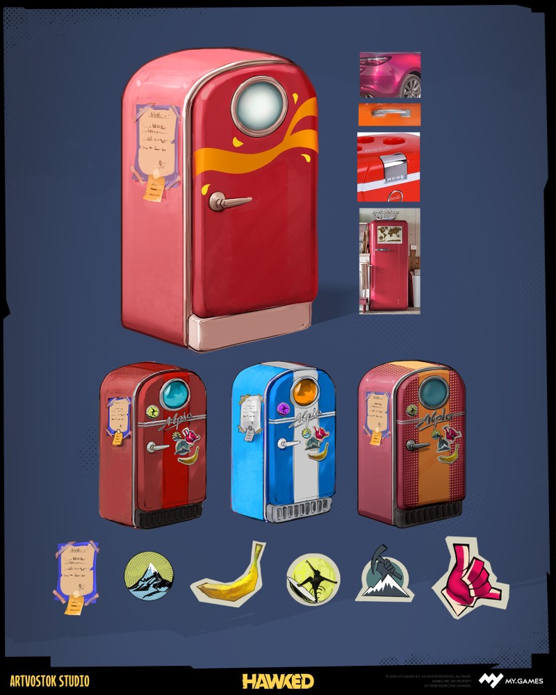 Our first concept art tasks were the surf board and the fridge. The main goal was to achieve a playful and colorful look for the props, so we did what we have to.